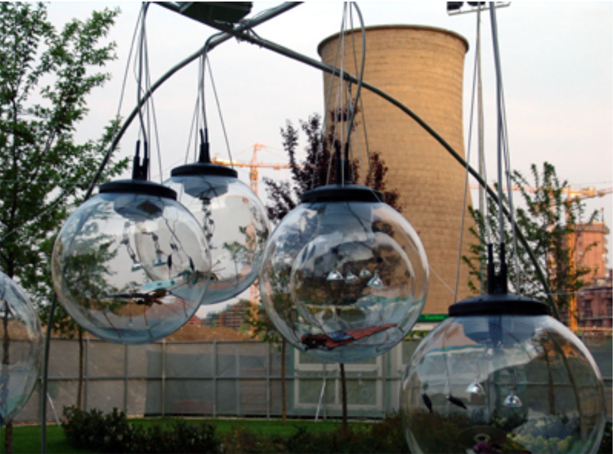 The resulting ‘dream’ works range from a tree that alters your sense of space (TEVAUHA), a sidewalk that opens up to a bandstand for street musicians (Peter Lindenmuth), a gold lame sweater that conceals Harvard University’s Science Center (Mary Elizabeth van der Cross), an operatic display of fireworks for the Charles River (Ean White), robotic insects for musical sculptures (Rudi Punzo), to a re-arrangement of the stars above MIT’s Chapel (Mary Sherman).